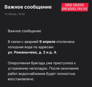 9 апреля 2026 в связи с технологическим сбоем на сетях электроснабжения, временно ограничена подачи горячего водоснабжения и тепла по следующим адресам.