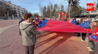 Десятки волонтёров развернули государственный флаг 20х10 метров под гимн Российской Федерации.